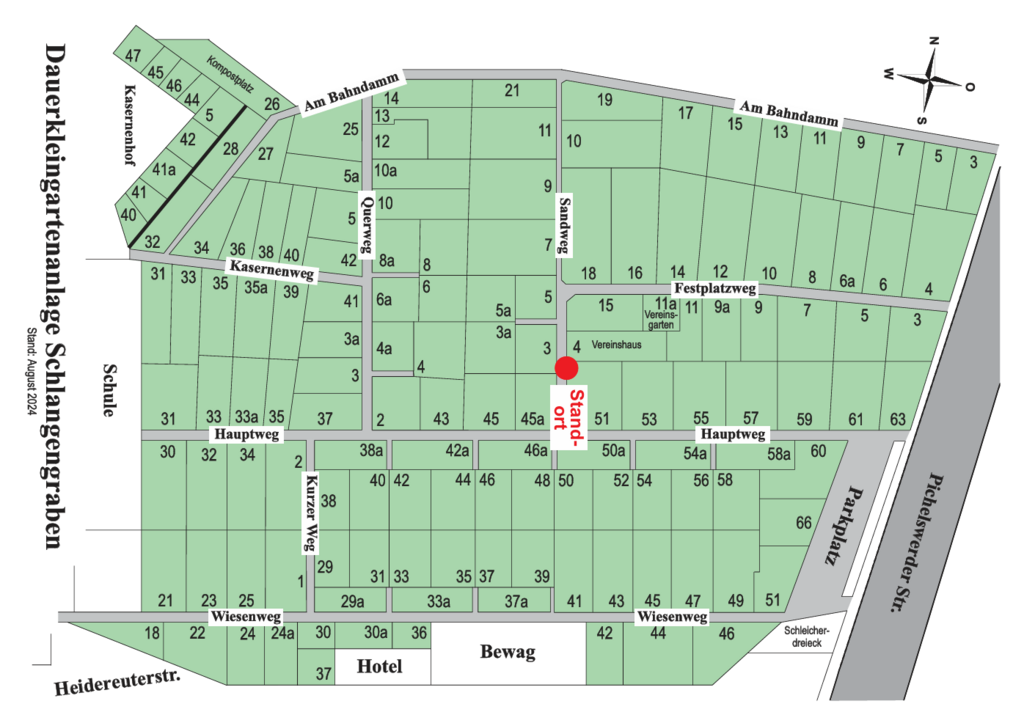 - Jedes Vereinsmitglied ist verpflichtet, den Bereich vor seiner Parzelle bis zur Wegmitte in Ordnung zu halten. Bei Eckgrundstücken gilt dieses natürlich für beide Wegseiten.